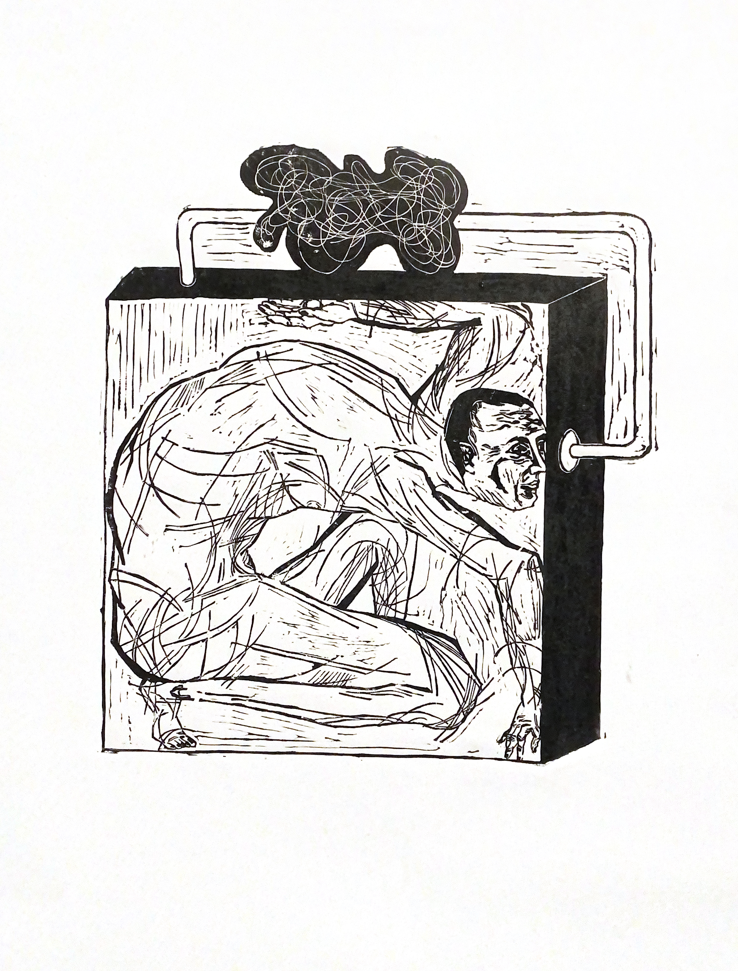 Self-ironing, Heal yourself harder serie, 2025, original linocut by Sylwia Zawiślak, handmade and printed on 50x70 cm paper, limited edition of 5 linoprint, part of the contemporary printmaking series, signed and numbered by the artist.