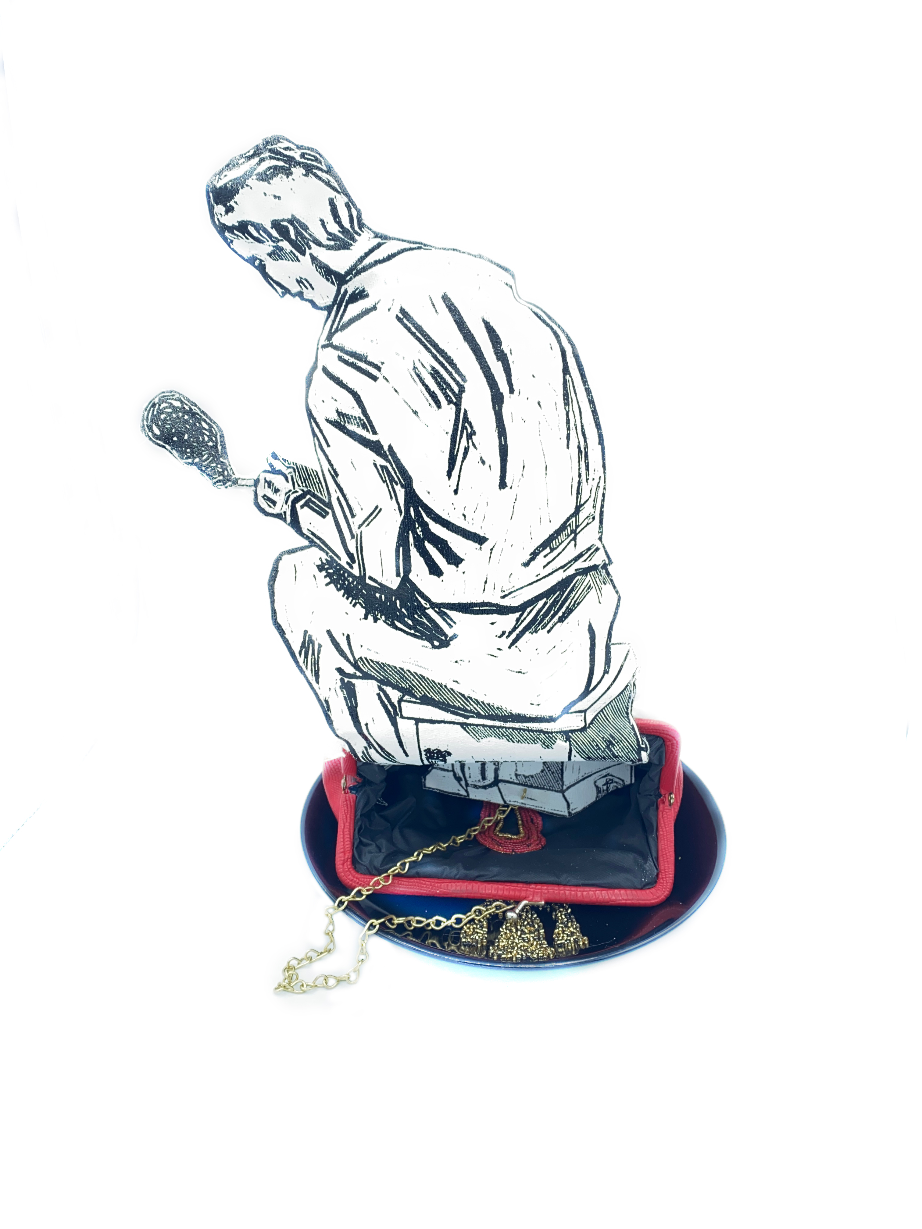 Object made from plate, chain, wallet, beads, linocut printed on canvas, wires.