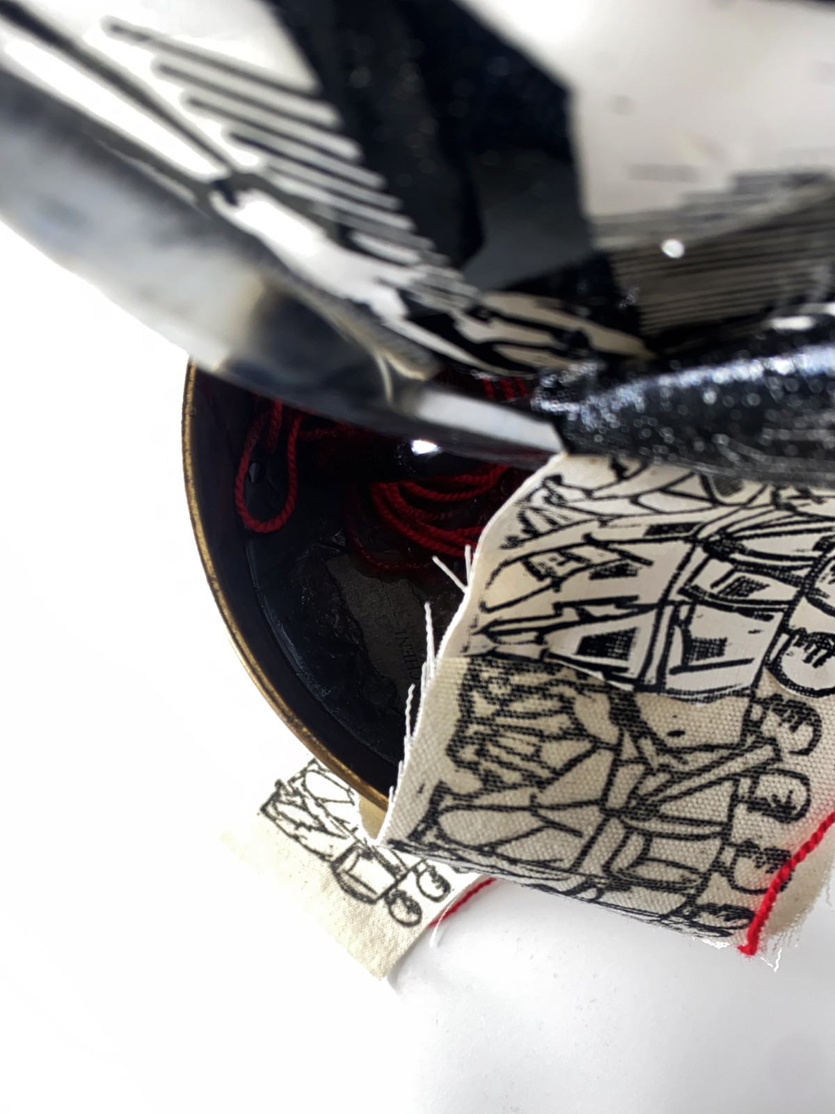 Overthinking 2024 Object made from metal cup, linocut printed on canvas, epoxy resin, metal scissors.