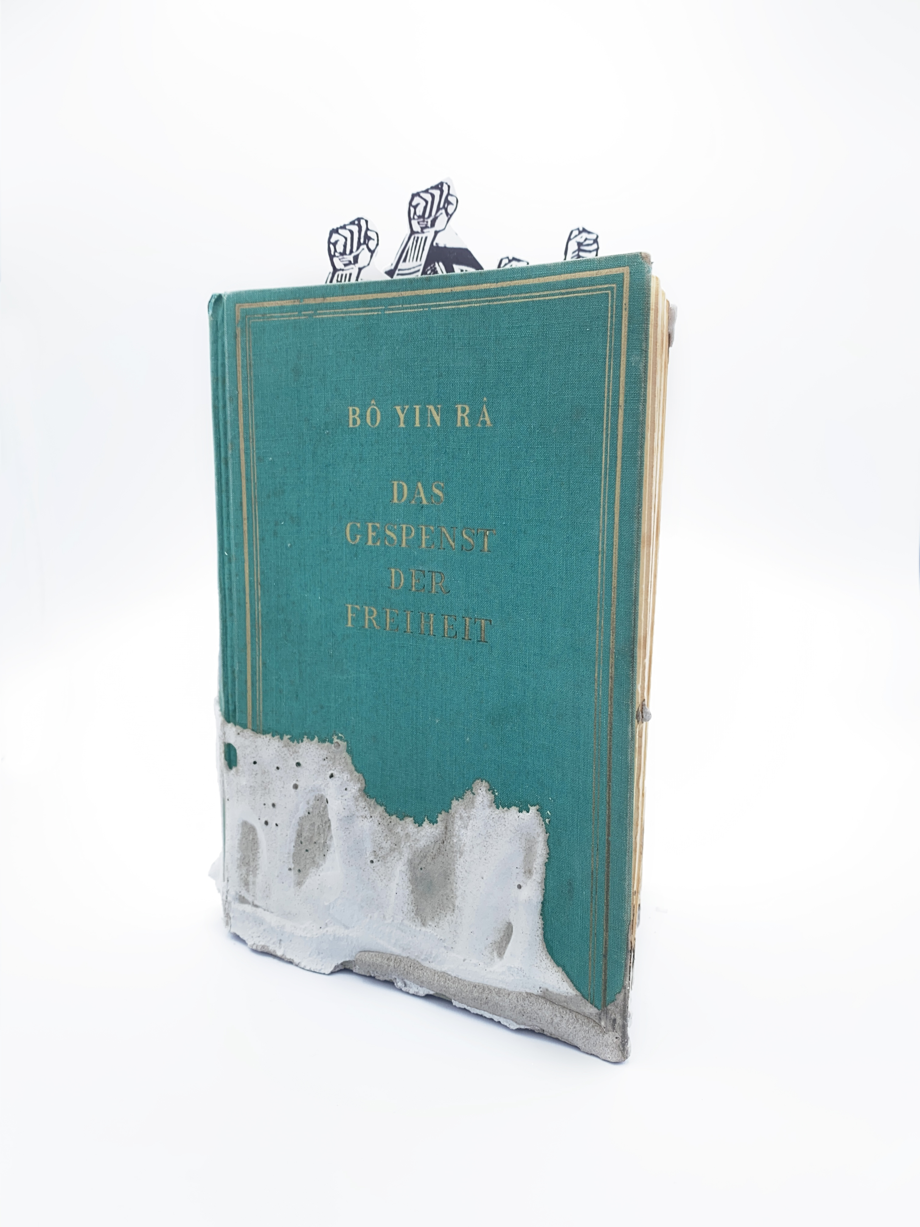Obiekt stworzony z książki, cementu i kawałek linorytu wydrukowany na papierze.