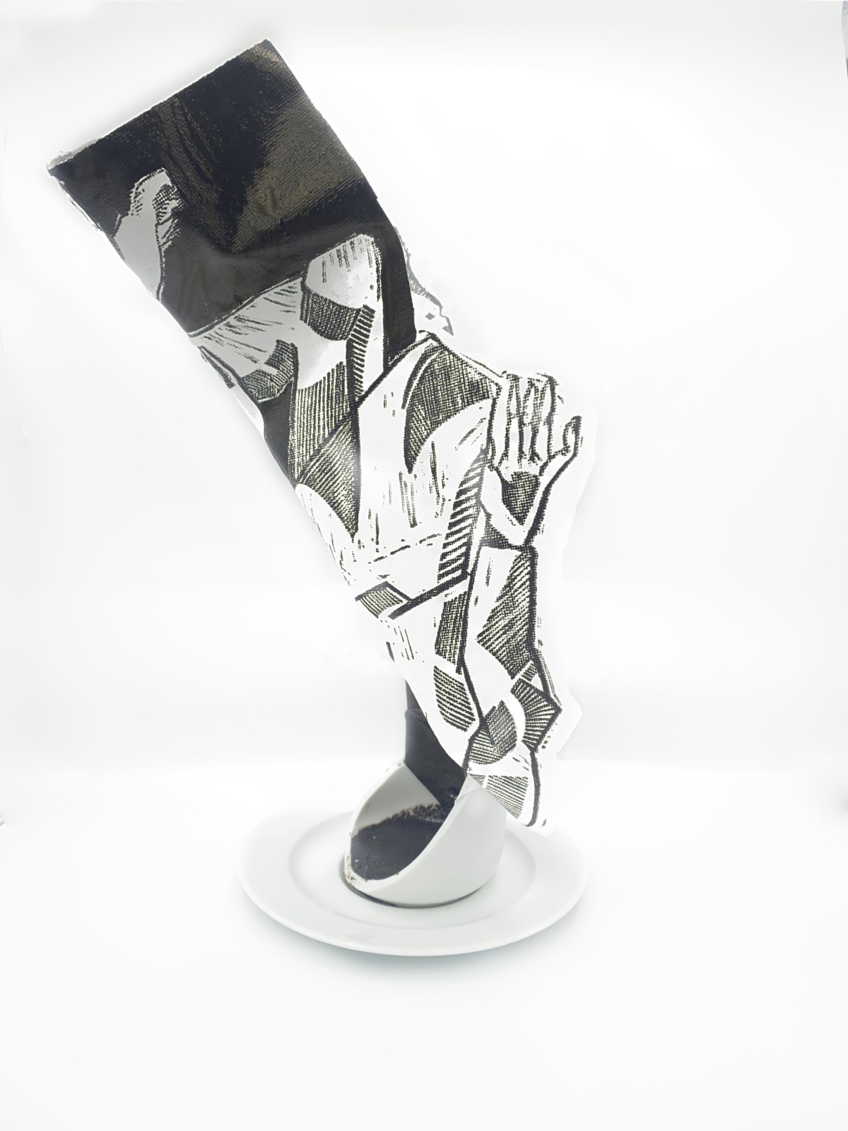 Object made from cup, linocut printed on canvas, epoxy resin.