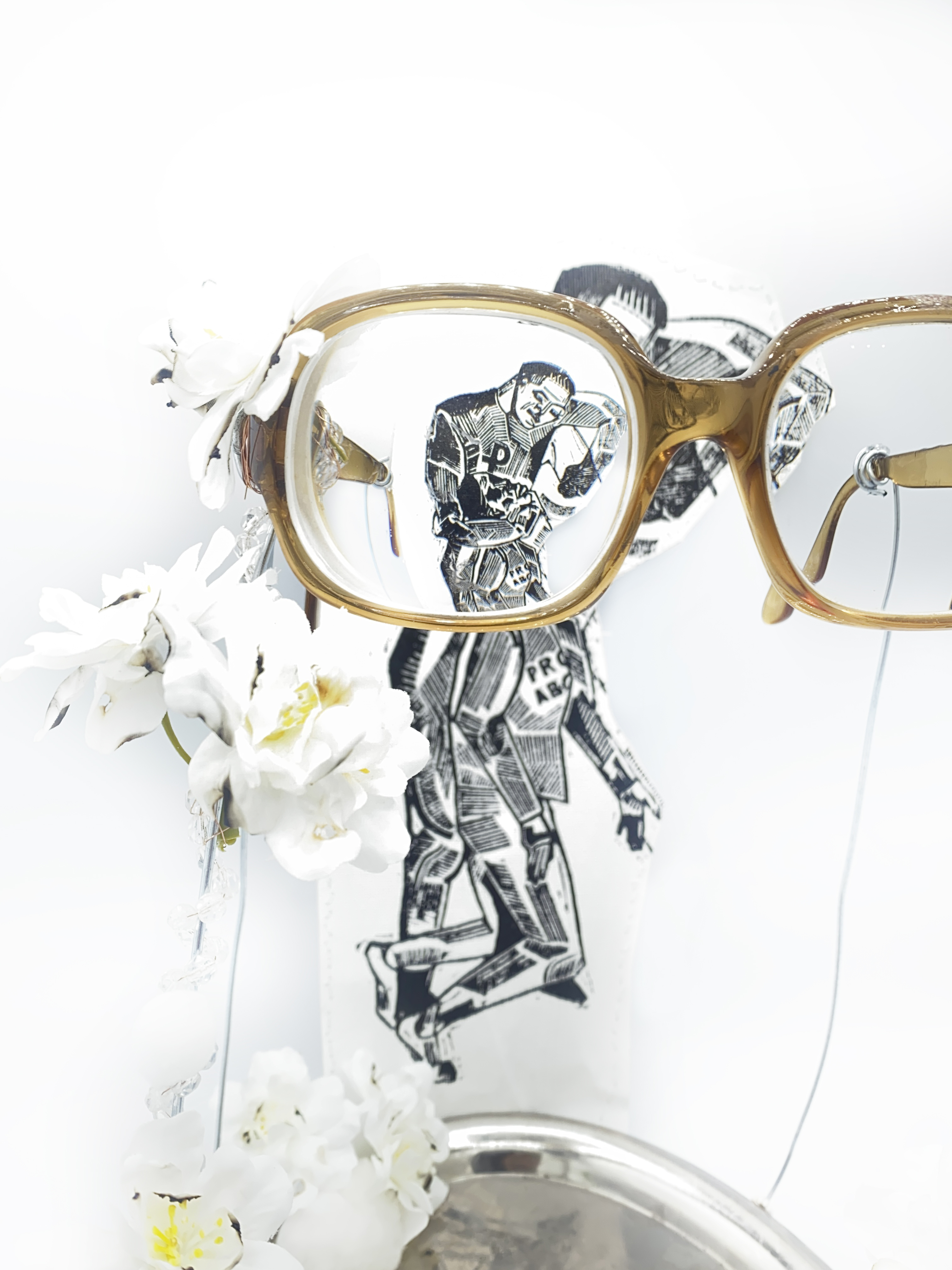 This is happening somwhere far away, not here 2024 Object made from linocut printed on canvas, metal, resin, glasses.